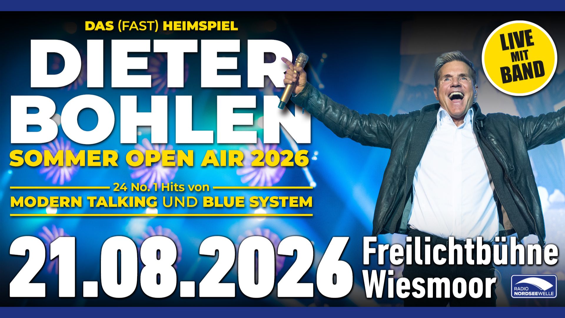 Die Blumenstadt Wiesmoor darf sich auf ein echtes Sommer-Highlight freuen: Am Freitag, den 21. August, kommt Pop-Titan Dieter Bohlen erstmals auf die Freilichtbühne Wiesmoor – mit einem mitreißenden Open-Air-Konzert voller Nostalgie, guter Laune und den größten Hits seiner Karriere.